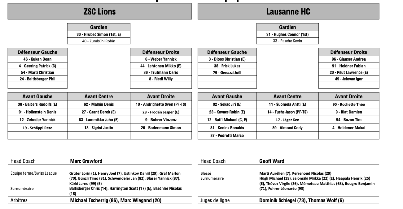 Formation des équipes et joueurs indisponibles pour le match Zurich vs Lausanne 20/04/2024 Follow SwissHabs Derniers articles Il y a une heure Fribourg-Gottéron engage un nouvel étranger Il y a 3 heures Colin Lindemann prolonge son contrat avec Zoug jusqu'en 2028 Il y a 4 heures Jannik Fischer prendra sa retraite à la fin de la saison Il y a 4 heures Reto Berra de retour sur la glace Il y a 4 heures Langnau devenait champion suisse il y bientôt 50 ans