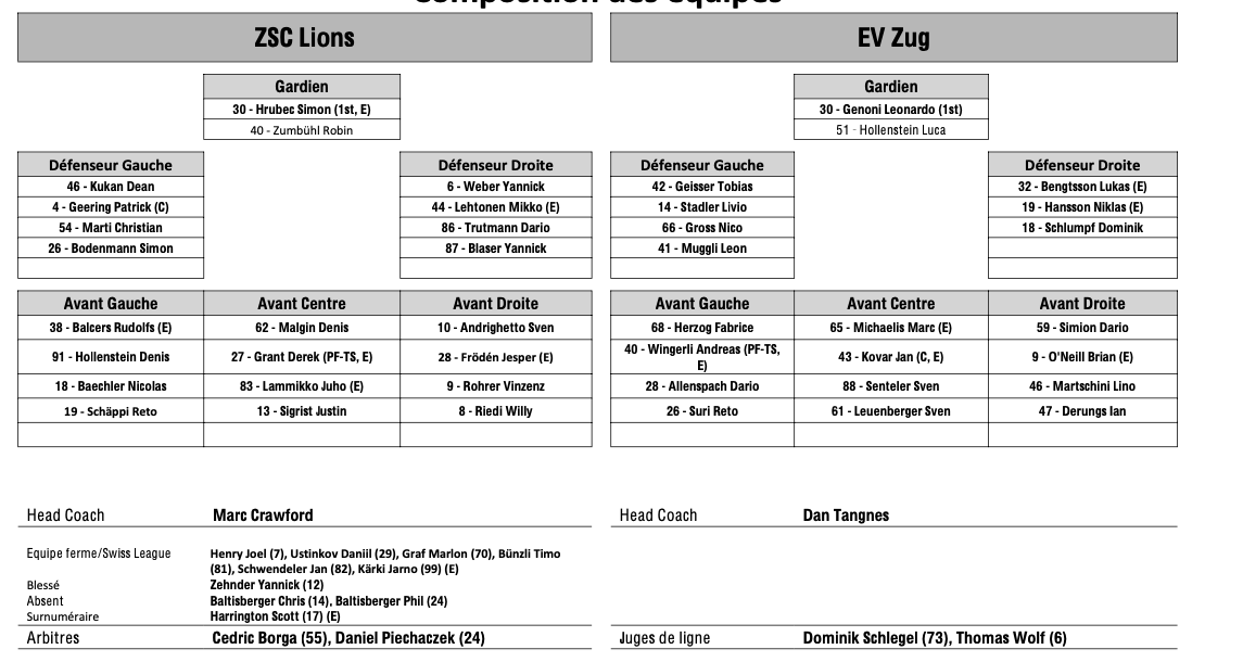 Formation des équipes et joueurs indisponibles pour le match Zurich vs Zoug 06/04/2024 Follow SwissHabs Derniers articles Il y a 58 minutes Le point sur l'infirmerie du HC Bienne Il y a 2 heures Trois nouveaux intronisés au Hall of Fame de Genève Il y a 4 heures Women's League : début des pré-play-offs, les play-out n’auront pas lieu Il y a 4 heures Les autres faits à retenir de cette nuit de NHL et de celle à venir Il y a 5 heures Connor McDavid atteint les 100 points pour une sixième saison consécutive