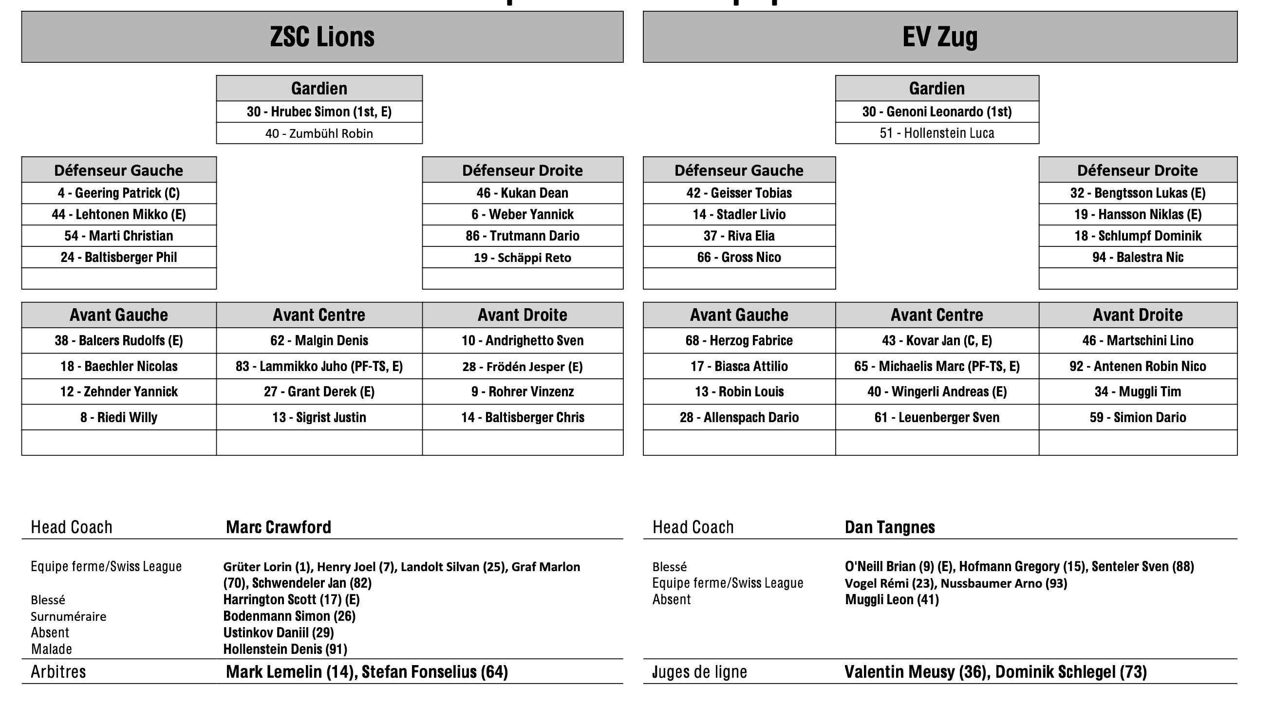 Formation des équipes et joueurs indisponibles pour le match Zurich vs Zoug 21/12/2023 Follow SwissHabs Derniers articles Il y a 10 heures Formation des équipes et joueurs indisponibles pour le match Berne vs Fribourg Il y a 10 heures Formation des équipes et joueurs indisponibles pour le match Rapperswil vs Ambri Il y a 10 heures Formation des équipes et joueurs indisponibles pour le match Genève vs Kloten Il y a 10 heures Formation des équipes et joueurs indisponibles pour le match Davos vs Bienne Il y a 10 heures Formation des équipes et joueurs indisponibles pour le match Lausanne vs Ajoie