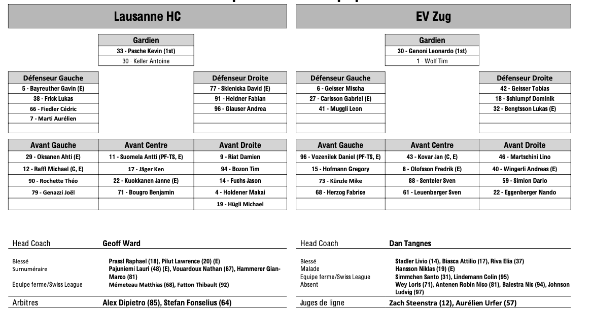 Formation des équipes pour le match Lausanne vs Zoug 06/01/2025 Follow SwissHabs Derniers articles Il y a 29 minutes Les Lakers vivront également un week-end important dans les urnes Il y a une heure La Chaux-de-Fonds lance un programme de soutien pour viser la National League Il y a 2 heures Suspension provisionnelle et ouverture d'une procédure contre Loïc In-Albon Il y a 3 heures Les Lausannoises évolueront en PostFinance Women’s League Il y a 6 heures Les autres faits à retenir de cette nuit de NHL et de celle à venir