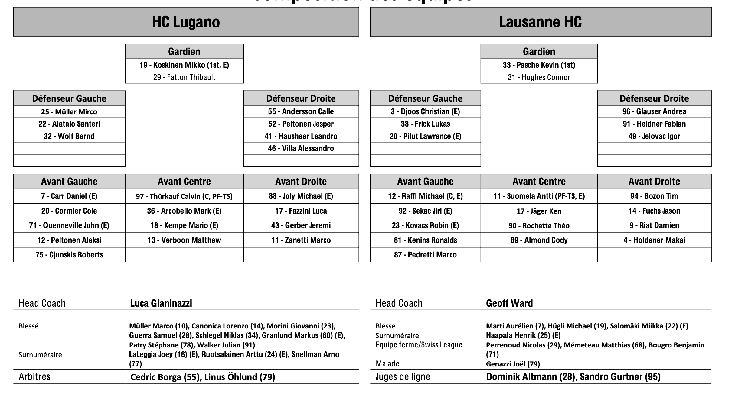 Formation des équipes pour le match Lugano vs Lausanne 27/01/2024 Follow SwissHabs Derniers articles Il y a 2 heures Les Sharks prolongent l'attaquant Kiefer Sherwood pour cinq ans Il y a 3 heures Tyler Myers à Dallas Il y a 4 heures Le point sur l'effectif de Lugano Il y a 6 heures Ambri prolonge Jussi Tapola et signe Petr Kodytek Il y a 7 heures Robin Grossmann manquera les derniers matchs de la saison régulière