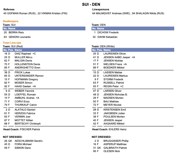 Formation des équipes pour le match Suisse vs Danemark 12/02/2022 Follow SwissHabs Derniers articles Il y a 53 minutes Women's League : les Fribourgeoises s'emparent du bronze Il y a 3 heures Filip Zadina était bien surnuméraire Il y a 5 heures Martin Plüss fait le point sur quelques dossiers chauds Il y a 7 heures Le point des joueurs et du directoire lausannois avant le début des play-offs Il y a 8 heures Jerry Turkulainen pourrait être sur la glace dès ce soir