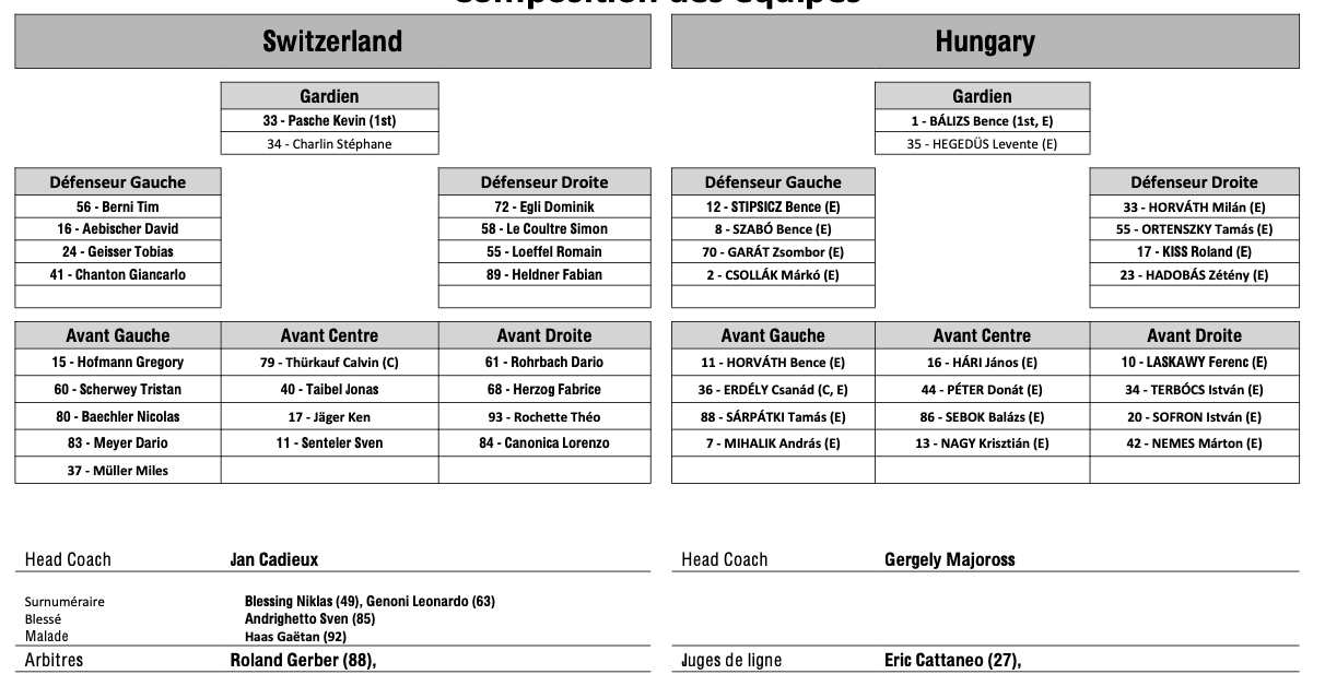 Formation des équipes pour le match Suisse vs Hongrie 23/04/2026 Photo: SIHF Follow SwissHabs Derniers articles Il y a une heure Martigny misera sur un nouveau staff de coaches Il y a 3 heures Formation des équipes pour le match Suisse vs Hongrie Il y a 3 heures Šimon Hrubec dénonce un « dopage à l’équipement » en Suisse Il y a 5 heures Mondiaux U18 : la Suisse souffre mais bat son plus gros adversaire Il y a 7 heures Niko Huuhtanen s'est bien engagé à Helsinki