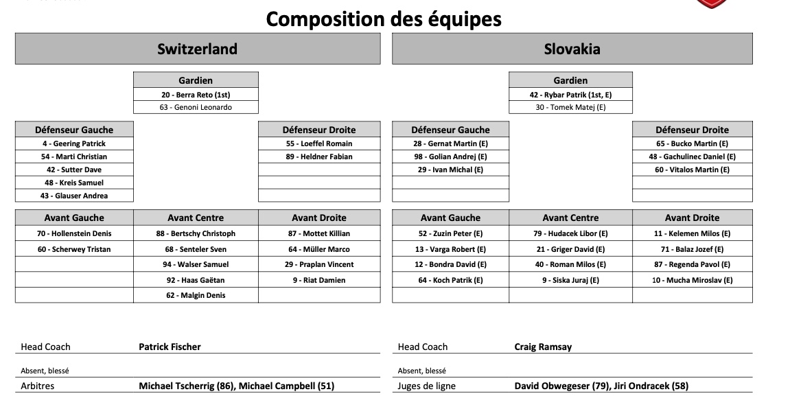 Formation des équipes pour le match Suisse vs Slovaquie 17/12/2021 Follow SwissHabs Derniers articles Il y a 2 heures La Chaux-de-Fonds a peut-être trouvé son nouveau coach Il y a 2 heures Alina Müller et le Fleet creusent l'écart en tête de classement Il y a 2 heures Trois contrats d'entrée paraphés cette nuit Il y a 3 heures Lars Steiner lance ses play-offs par un doublé Il y a 3 heures Les faits à retenir de cette nuit de NHL et de celle à venir