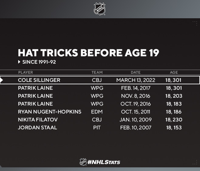 Sillinger, Filatov et l'actuel attaquant des Blue Jackets Patrik Laine représentent cinq des six derniers cas où un joueur de la NHL a réalisé un tour du chapeau avant l'âge de 19 ans.