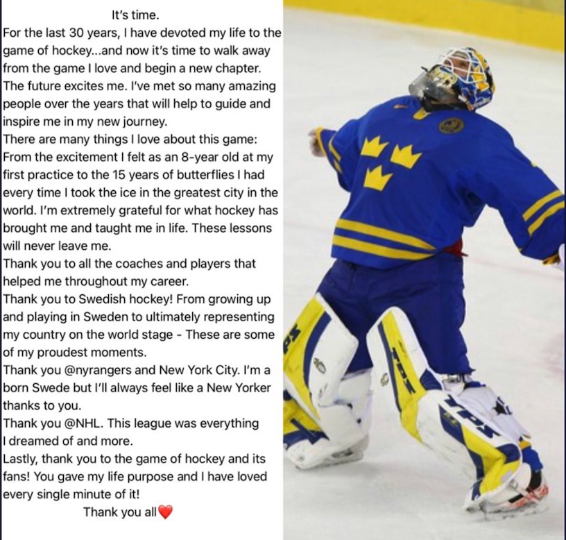 Le gardien de 39 ans l'a annoncé à l'instant lors d'une conférence de presse. Il aura ainsi joué plus de 1'000 matchs en NHL lors de 15 saisons avec les Rangers de New York avant de passer aux Capitals de Washington avec qui il n'aura finalement pas eu l'occasion de jouer.