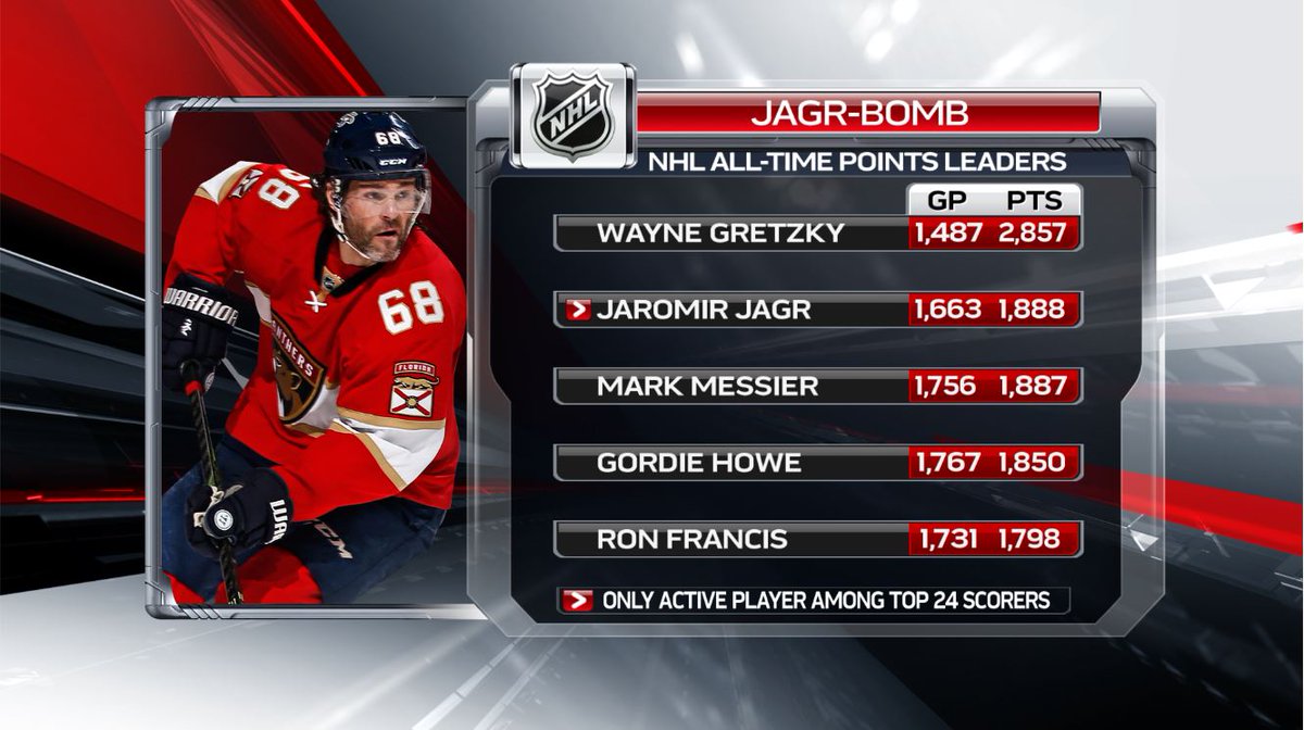 Sportsnet a en effet calculé que si il gardait sa production moyenne il dépasserait Gretzky à l'âge de 55 ans et un mois. On est certain que Jagr est prêt à relever le défi