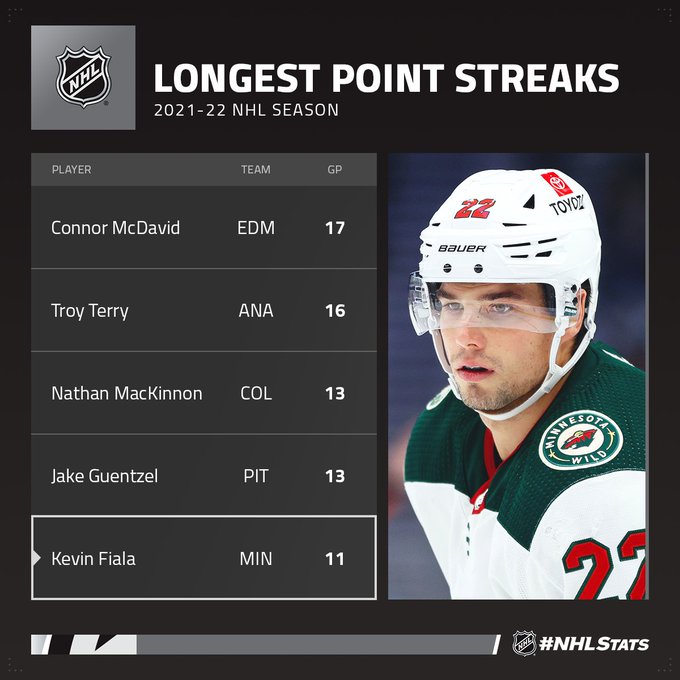 C'est un match de moins que la plus longue série dans l'histoire du Wild, record détenu par Mikael Granlund (12 GP en 2016-17).