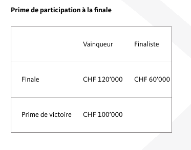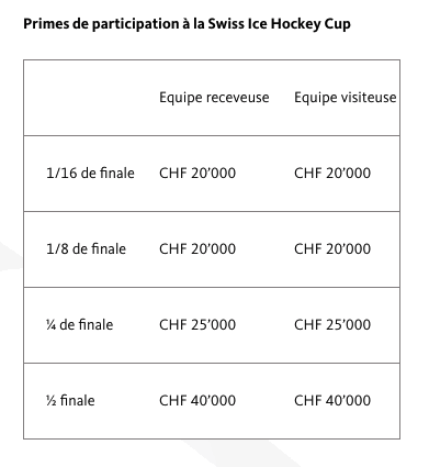 L’indemnisation financière versée aux clubs correspond à la somme fixée dans le contrat précédent, avec en sus un bonus pécuniaire supplémentaire alloué au vainqueur de la compétition. Tout comme jusqu’à présent, un total de CHF 1'500'000.00 sera versé aux clubs participant à la Coupe. Cette somme comprend le prix en espèces pour la finale d’un montant inchangé de CHF 180'000.00, dont le vainqueur touche CHF 120'000.00. Dorénavant, le vainqueur de la Swiss Ice Hockey Cup touchera en sus une prime de CHF 100'000.00.