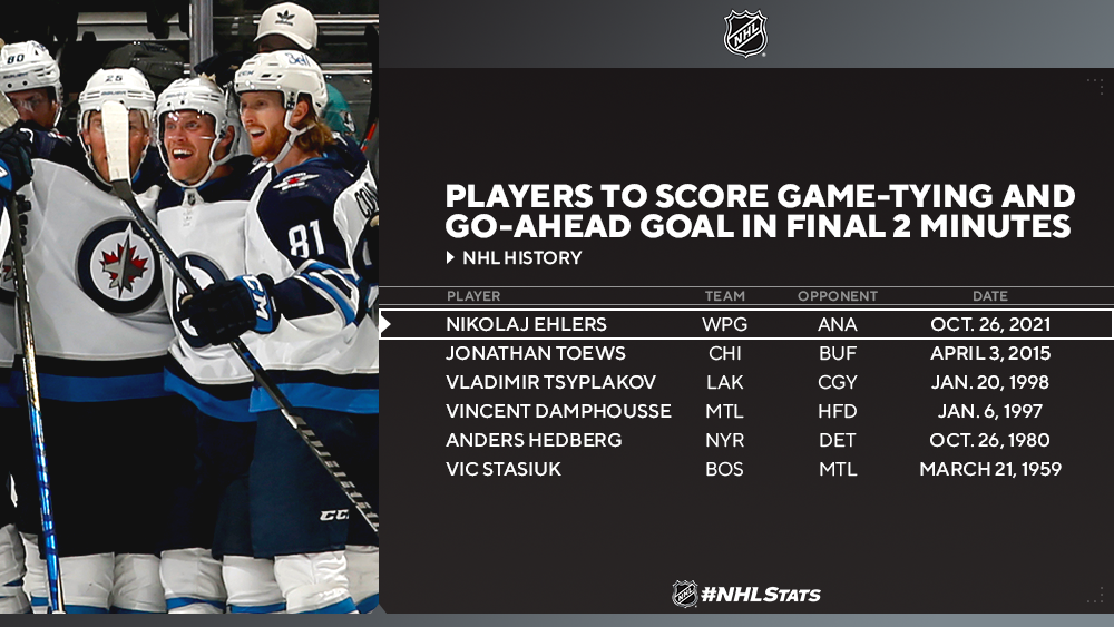 Avec une avance de 3 à 2 à 1:20 de la fin du match, Nikolaj Ehlers a marqué deux buts en 19 secondes pour aider les Jets à se reprendre et à assommer les Ducks. Ehlers, qui a inscrit les deux buts les plus rapides par un seul joueur dans l'histoire des Jets/Thrashers, est devenu le sixième joueur de l'histoire de la LNH à marquer un but décisif et un but d'ouverture dans les deux dernières minutes.
