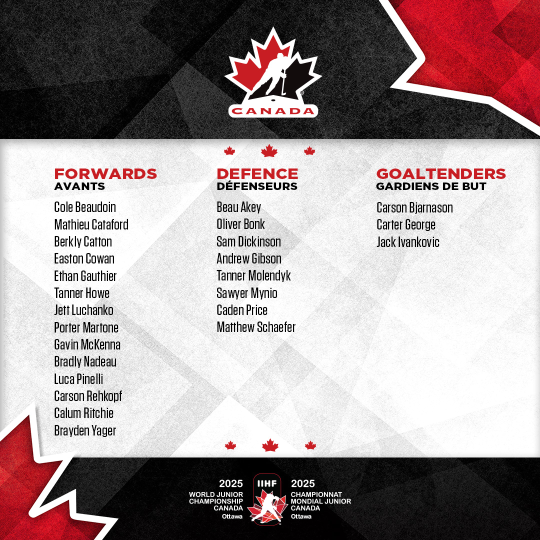 Le Canada dévoile sa sélection pour les Mondiaux juniors 14/12/2024 Follow SwissHabs Derniers articles Il y a 36 minutes Quelques semaines d'absence pour Dominic Zwerger Il y a 2 heures Les autres faits à retenir de cette nuit de NHL et de celle à venir Il y a 4 heures Fribourg a pu profiter de la vente de feu de Jukurit Il y a 4 heures Un record pour les Stars de Dallas Il y a 5 heures Les Devils s'imposent mais notre trio suisse reste muet