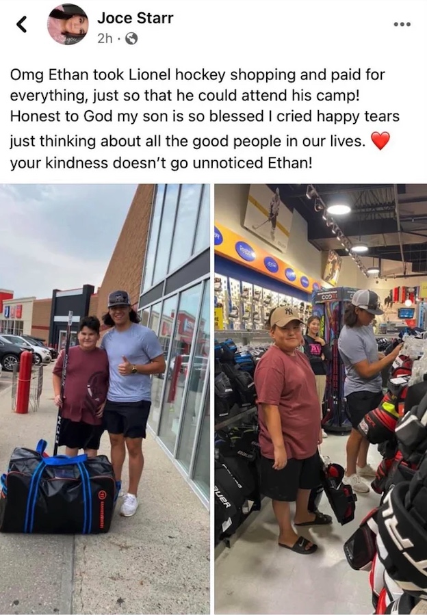 Il a en effet accompagné un jeune dans un magasin spécialisé pour lui offrir tout le matériel nécessaire à accomplir son rêve et prendre part à un camp de hockey ce mois-ci.