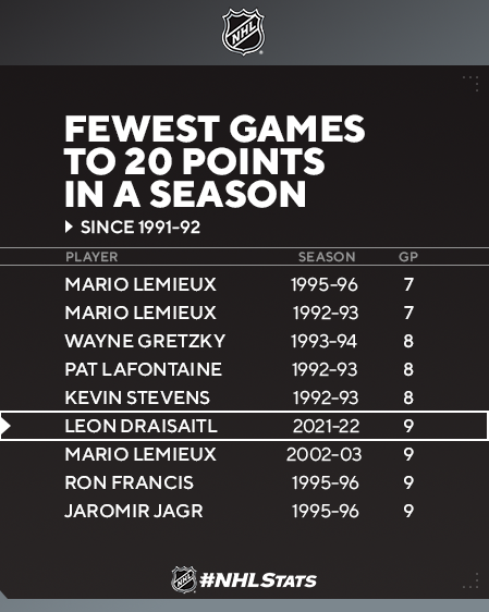 Draisaitl (9-11-20 en 9 GP) est devenu le deuxième joueur de l'histoire de la franchise à enregistrer 20 points en une saison en moins de 10 matchs, rejoignant Wayne Gretzky qui a accompli l'exploit à cinq reprises (7 GP en 1986-87, 1984-85 et 1983-84 ; 8 GP en 1987-88 et 1985-86).