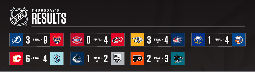 * La performance de neuf buts de jeudi est le deuxième plus haut total de la franchise dans un match, derrière un concours de 10 buts le 26 novembre 1997 (10-5 W vs. BOS). La Floride est également devenue la première équipe à marquer neuf buts dans un match cette saison.