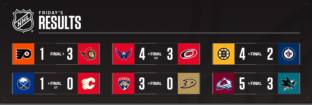 Boston (38-19-5, 81 points) et Washington (35-18-10, 80 points) ont gagné vendredi et se sont rapprochés de la troisième place dans les divisions Atlantique et Métropolitaine, respectivement :