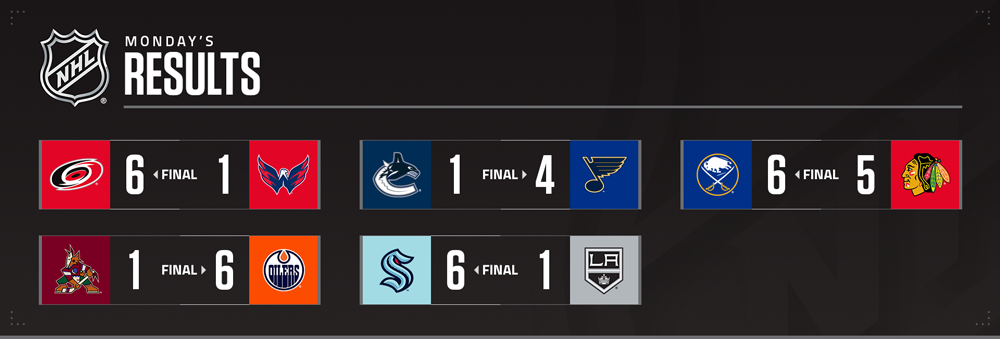 Au United Center, les Blackhawks ont pris une avance de quatre buts, les Sabres ont effacé ce déficit, Alex DeBrincat a donné l'avantage à Chicago et Alex Tuch a égalisé le score à 2:14 de la fin, avant que Tage Thompson ne marque le but de la victoire dans les 12 dernières secondes. Buffalo a rejoint Carolina (1er janvier à CBJ) comme deuxième équipe cette saison à surmonter un déficit de quatre buts pour gagner.