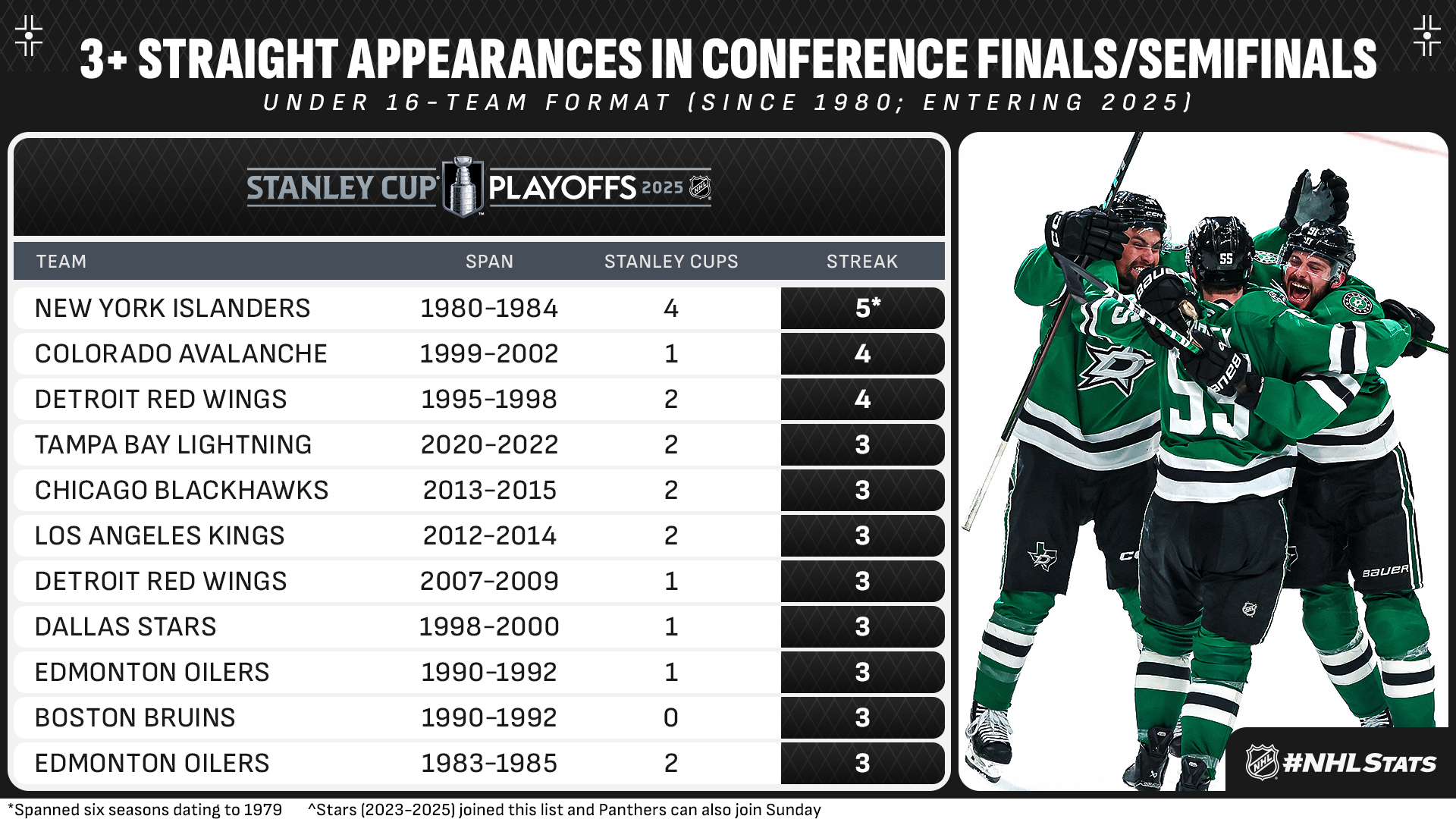 * Les Stars sont en route vers le dernier carré des séries éliminatoires de la Coupe Stanley pour la 14e fois dans l'histoire de la franchise, ce qui les place en deuxième position parmi les franchises qui ne font pas partie des six premiers pays, derrière les Flyers (16). Il s'agit de la deuxième série de trois participations consécutives aux finales de conférence pour Dallas, après les années 1998 à 2000, au cours desquelles la franchise a remporté son seul championnat de la Coupe Stanley (1999).