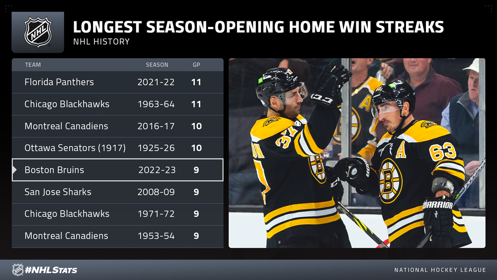 C'est la 14e fois que les Bruins connaissent une série de victoires à domicile d'au moins neuf matchs au cours d'une campagne et la première depuis 2018-19 (12-0-0 du 5 février au 27 mars 2019).