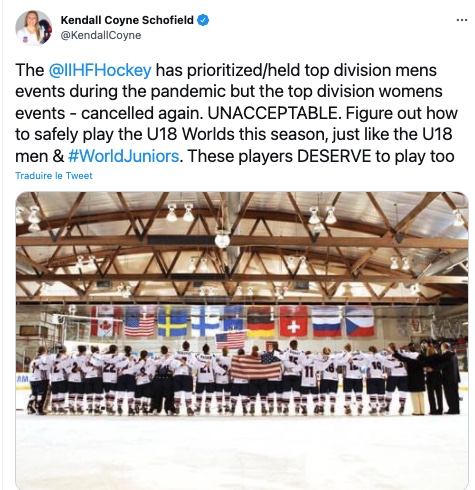 Kendall Coyne Schofield : "L'IIHF a donné la priorité aux événements masculins de première division et les a maintenus pendant la pandémie, mais les événements féminins de première division ont encore été annulés. INACCEPTABLE. Trouvez un moyen de faire jouer les championnats du monde U18 en toute sécurité cette saison, tout comme les championnats masculins U18 et les championnats du monde juniors. Ces joueurs méritent de jouer aussi."