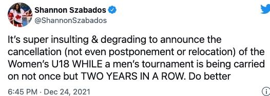 Shannon Szabados : "C'est super insultant et dégradant d'annoncer l'annulation (pas même le report ou la délocalisation) des U18 féminins alors qu'un tournoi masculin se déroule non pas une mais DEUX ANNÉES DE SUITE. Faites mieux"