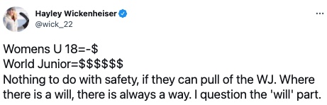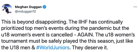 Meghan Duggan : "C'est plus que décevant. L'IIHF a toujours donné la priorité aux événements masculins pendant la pandémie, mais l'événement féminin U18 est annulé - une fois de plus. Le tournoi féminin U18 doit être joué en toute sécurité cette saison, tout comme les U18 masculins et les #WorldJuniors. Elles le méritent."