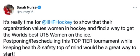 Sarah Nurse : C'est vraiment le moment pour @IIHFHockey de montrer que leur organisation accorde de l'importance aux femmes dans le hockey et de trouver un moyen d'amener les meilleures femmes U18 du monde sur la glace. Le report ou la reprogrammation de ce tournoi TOP TIER tout en gardant la santé et la sécurité à l'esprit serait une excellente façon de commencer !"
