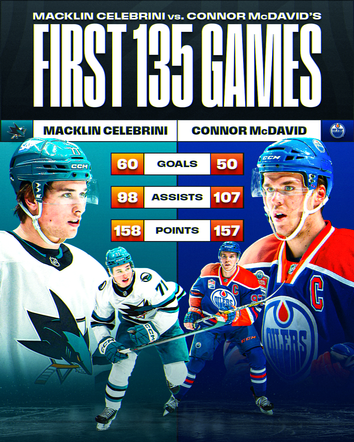 Les stats de Macklin Celebrini et Connor McDavid lors de leurs 135 premiers matchs 18/03/2026 Follow SwissHabs Derniers articles Il y a 51 minutes Les autres faits à retenir de cette nuit de NHL et de celle à venir Il y a une heure Des nouvelles de Denis Malgin Il y a une heure Janis Moser et le Lightning s'imposent Il y a une heure Les images du combat de Yanis Lutz Il y a une heure Les stats de Macklin Celebrini et Connor McDavid lors de leurs 135 premiers matchs