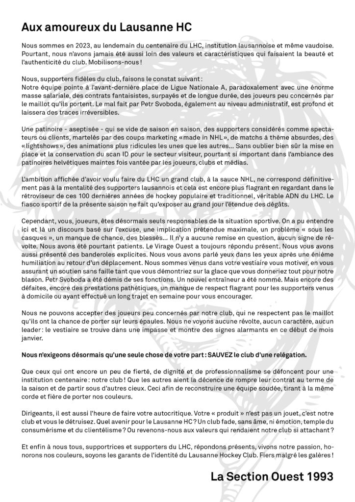 Les ultras lausannois s'adressent aux joueurs et dirigeants 07/01/2023 Follow SwissHabs Derniers articles Il y a 10 minutes Une courte absence pour Damiano Ciaccio Il y a 46 minutes Lars Steiner pousse les Huskies vers la victoire Il y a 59 minutes Trois points pour Pius Suter dans une belle victoire des Blues Il y a 10 heures Davos pourrait signer un nouveau record de National League Il y a 13 heures Rikard Grönborg ne pourra plus parler à ses joueurs trois matchs durant