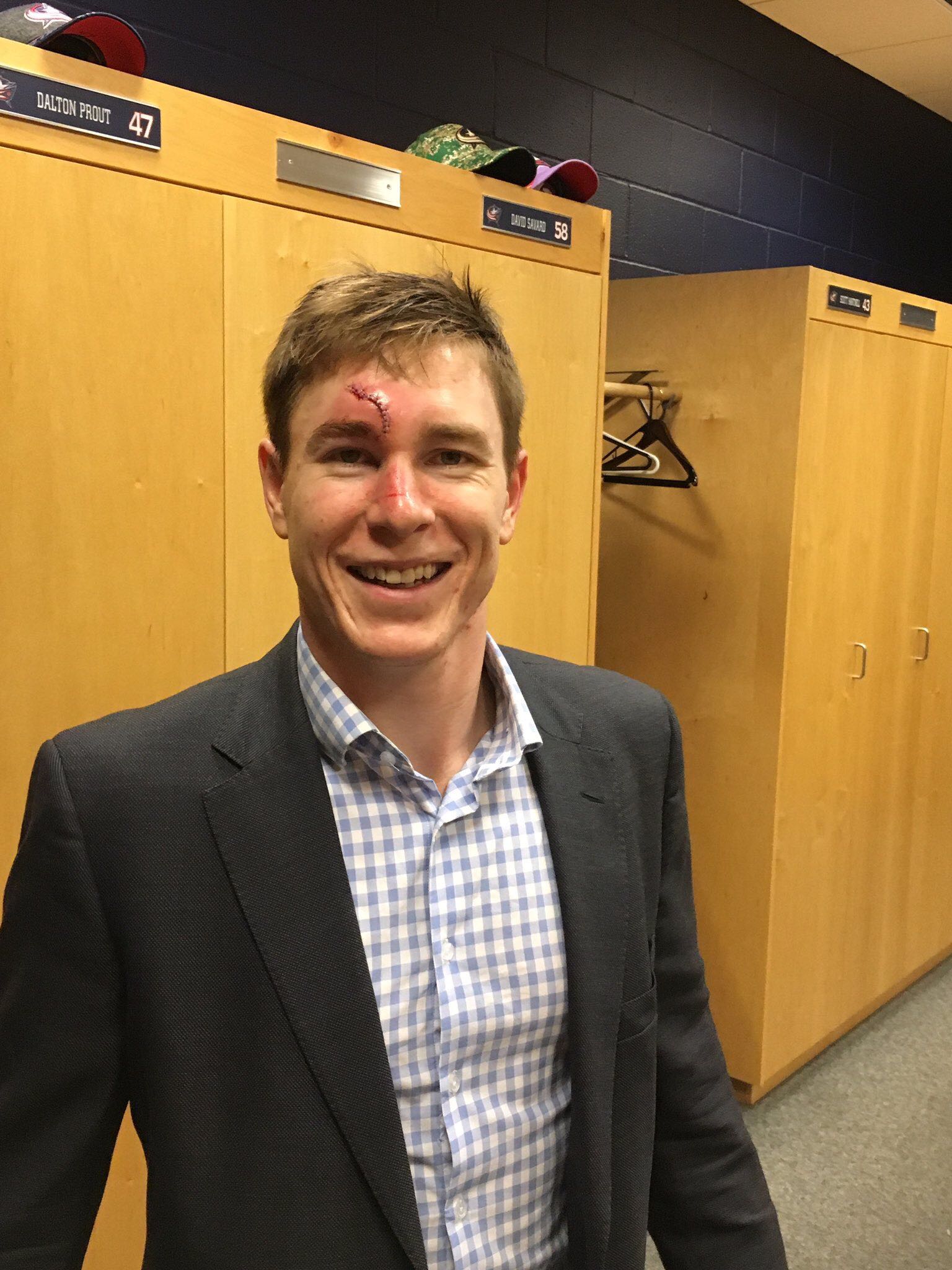 Après 36 agraphes pour fermer sa blessure, il est en effet revenu au jeu et c'est lui qui a par la suite marqué le but gagnant des Blue Jackets, en infériorité numérique s'il vous plaît. Avant d'être nommé première étoile du match et de donner des interviews en toute modestie.