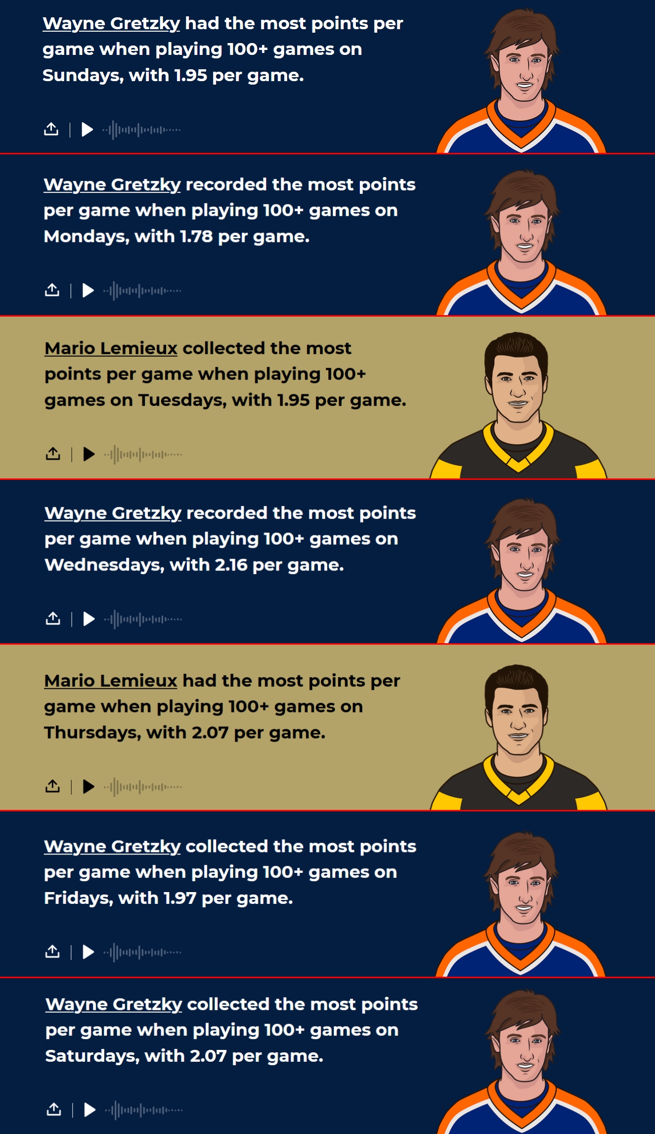 Meilleure moyenne de point par match selon le jour de la semaine 08/08/2021 Follow SwissHabs Derniers articles Il y a 2 heures Les plus beaux arrêts de la dernière semaine de NHL Il y a 3 heures Formation des équipes et joueurs indisponibles pour le match Fribourg vs Genève Il y a 3 heures Formation des équipes et joueurs indisponibles pour le match Davos vs Zurich Il y a 5 heures Akira Schmid parmi les nominés pour le trophée Bill Masterton Il y a 6 heures Début de la préparation pour les Mondiaux : première sélection de Patrick Fischer