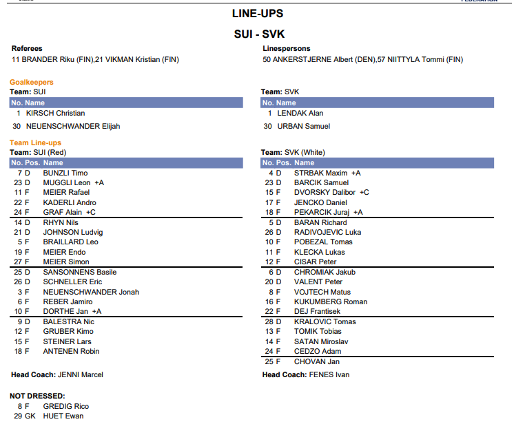 Mondiaux U20 : formation des équipes pour le match Suisse vs Slovaquie 27/12/2024 Follow SwissHabs Derniers articles Il y a une heure Les autres faits à retenir de cette nuit de NHL et de celle à venir Il y a une heure U18-Elit et U21-Elit : début des play-offs et du tour de classement Il y a 3 heures Un doublé et une première étoile pour Lian Bichsel Il y a 4 heures Personne n'a voulu de Chris DiDomenico en Suisse, la position de Jussi Tapola est également fragilisée Il y a 4 heures Quelques semaines d'absence pour Nino Niederreiter