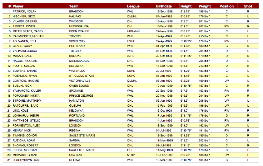 Nico Hischier figure en effet au 2ème rang de la liste diffusée aujourd'hui et Nolan Patrick toujours au 1er. La liste complète avec les joueurs suisses est visibles ici