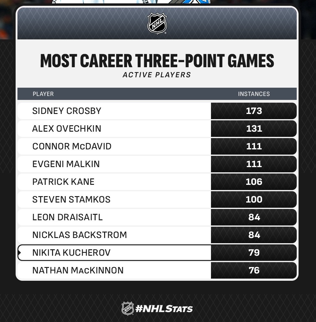 Nikita Kucherov a atteint le plateau des 80 points en 47 matchs et est devenu le troisième joueur en activité à atteindre cette marque en autant de matchs ou moins. Il rejoint Connor McDavid (44 GP en 2022-23 et 46 GP en 2020-21) et Sidney Crosby (47 GP en 2006-07).