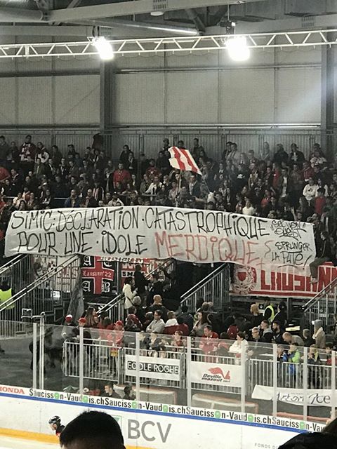 Ils se sont malheureusement encore illustré hier soir avec une baderolle déplacée envers leur joueur Axel Simic suite à son interview dans la Gruyère que je vous ai partagé ici.