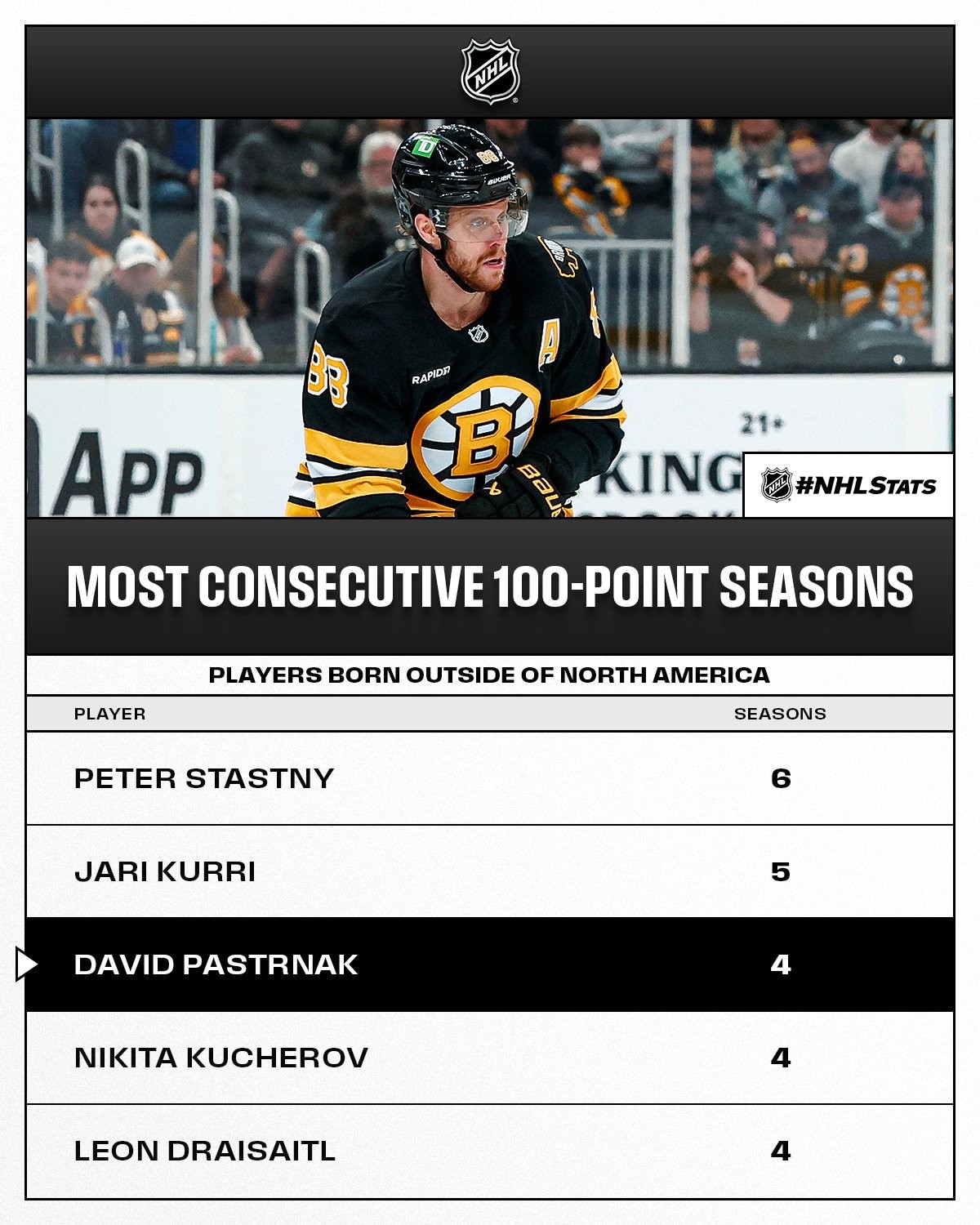 À l’échelle de la NHL, cette performance le place également dans un cercle très restreint parmi les joueurs nés hors d’Amérique du Nord. Il rejoint ainsi Nikita Kucherov et Leon Draisaitl avec une quatrième saison consécutive à 100 points, soit la troisième plus longue série du genre.