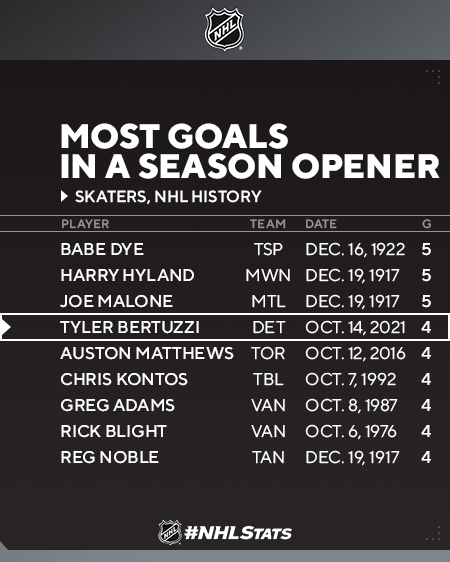 Bertuzzi, qui a participé à son premier match depuis le 30 janvier, est devenu le neuvième joueur de l'histoire de la LNH à avoir marqué quatre buts ou plus dans un match d'ouverture de saison.