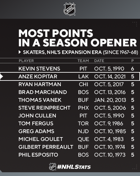 Anze Kopitar (3-2-5) a inscrit son cinquième tour du chapeau dans la LNH et a égalé son meilleur score en carrière avec cinq points, alors que les Kings ont triomphé lors du premier match de la saison au STAPLES Center.