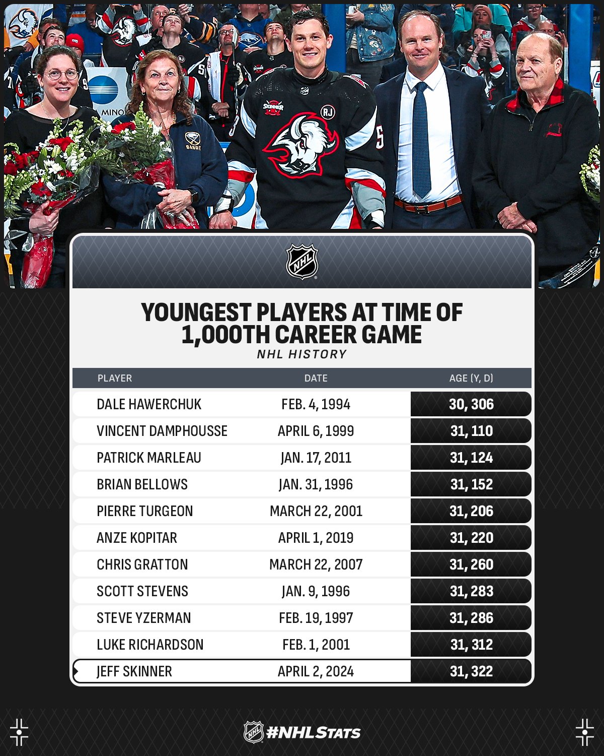 Le seul joueur en activité à avoir réalisé cet exploit à un plus jeune âge est Anze Kopitar (31 ans et 220 jours le 1er avril 2019).