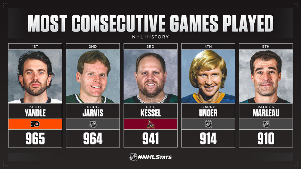 Le défenseur des Flyers Keith Yandle a participé mardi à son 965e match consécutif en saison régulière et a dépassé Doug Jarvis (964 GP du 8 octobre 1975 au 10 octobre 1987) pour détenir la plus longue série d'"Ironman" de l'histoire de la Ligue.