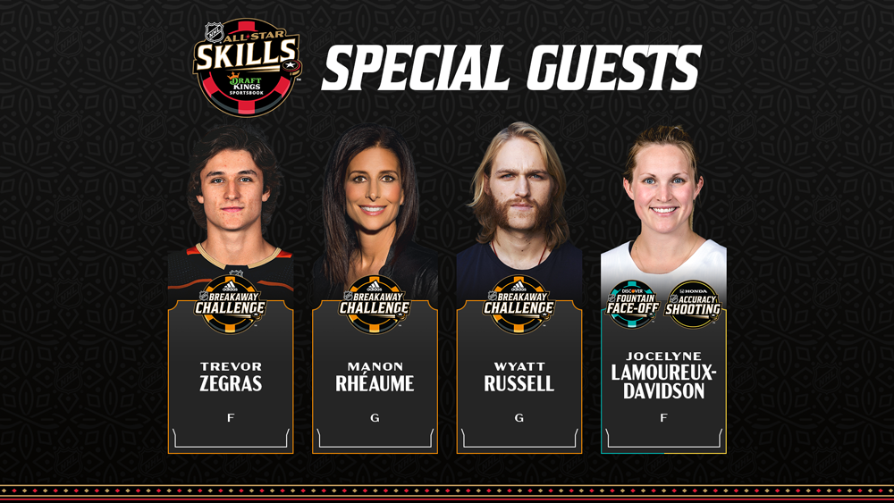 En plus de Zegras, les autres invités spéciaux du NHL All-Star Skills participant à divers événements comprendront la pionnière du hockey féminin Manon Rhéaume, la triple médaillée olympique Jocelyne Lamoureux-Davidson et l'acteur Wyatt Russell.