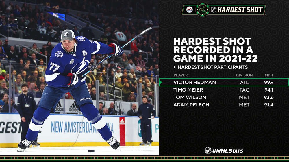 Les quatre participants au concours EA SPORTS NHL Hardest Shot tenteront tous de remporter le titre pour la première fois : Le défenseur du Lightning Victor Hedman, l'attaquant des Sharks Timo Meier, le défenseur des Islanders Adam Pelech et l'attaquant des Capitals Tom Wilson.