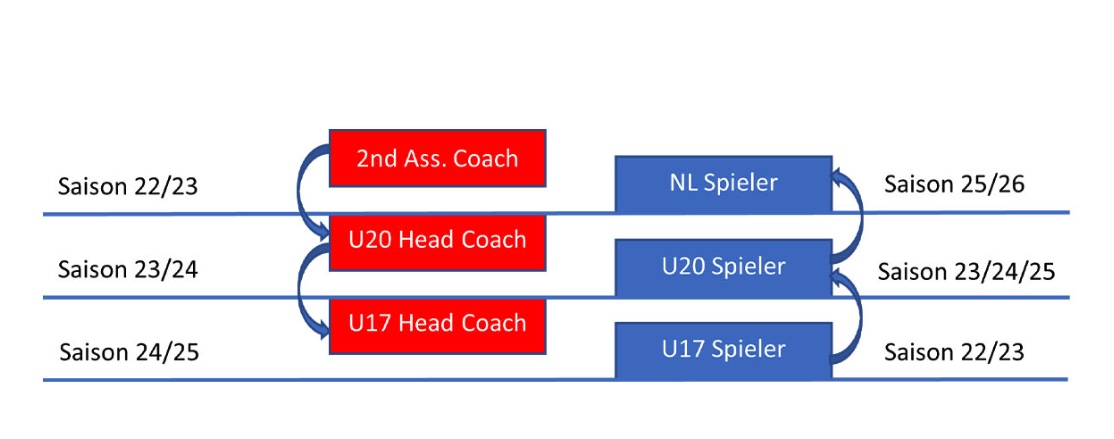 A partir de la nouvelle saison, les SC Rapperswil-Jona Lakers introduisent ce que l'on appelle la "Coaches Rotation" aux niveaux de performance - donc à partir des M17 Elite. Concrètement, cela signifie que les coachs professionnels changent d'échelon chaque année à partir des M17 jusqu'au deuxième coach assistant de l'équipe de National League. Si l'on prend l'exemple de Sven Berger, cela signifie qu'il sera assistant en National League la saison prochaine, qu'il s'occupera des M20 Elit en tant que headcoach lors de la saison 2023/24 et qu'il reprendra les M17 Elit la saison suivante. Après trois ans, il retournera en National League. La rotation des coaches se déroule ainsi dans le sens inverse du parcours naturel des joueurs de la relève. Cela permet de garantir que tous les joueurs soient encadrés chaque année par d'autres coaches. D'autre part, les coaches peuvent acquérir de l'expérience à tous les niveaux de développement et ont la possibilité de se perfectionner au plus haut niveau possible. Quant aux jeunes joueurs, ils entrent très tôt en contact avec la philosophie top-down des Lakers et vivent la culture de haute performance du club dès leur plus jeune âge.