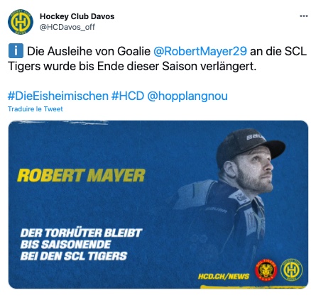 Robert Mayer terminera bien la saison à Langnau 31/01/2022 Lire également ici Follow SwissHabs Derniers articles Il y a une heure Les Zoug Women à une victoire d’un premier sacre historique Il y a 2 heures Roger Rönnberg s'épanouit en Suisse Il y a 5 heures HC Ajoie : Kristian Tanus aurait pu ne jamais pouvoir jouer au hockey Il y a 6 heures Suivez-nous sur Instagram Il y a 7 heures Vers une ouverture de l’AHL aux joueurs de 19 ans draftés au premier tour