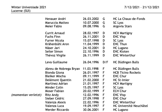 L’Universiade d’hiver se tiendra du 11 au 21 décembre 2021 en Suisse centrale et aux Grisons. Durant le plus grand événement multisports destiné aux étudiants, 60 lots de médailles seront attribués dans dix spécialités sportives lors de onze jours de compétition. Deux sélections suisses sont en lice en hockey sur glace. Suite à la journée de sélection du dimanche 31 octobre à Fribourg, les compositions des équipes féminine et masculine pour l’Universiade d’hiver 2021 ont été communiqués le lundi 1er novembre.
