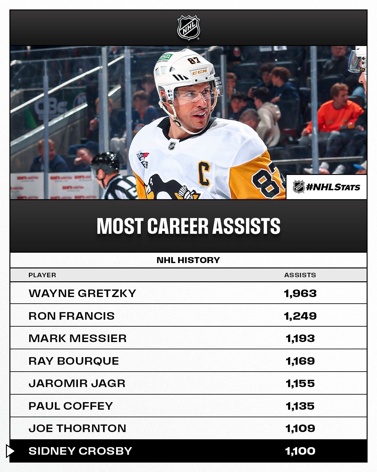 Sidney Crosby a une nouvelle fois marqué l’histoire de la National Hockey League en atteignant un cap symbolique. Le capitaine des Pittsburgh Penguins a enregistré sa 1’100e assistance en carrière, devenant ainsi le huitième joueur de tous les temps à atteindre cette marque prestigieuse.