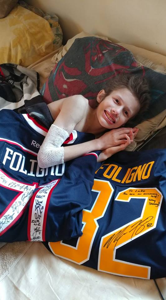 Le jeune Luke, qui souffre d'angiosarcome (un cancer des tissus de la peau), s'est en effet vu offrir un maillot de chacun des deux frères, dont celui des Blue Jackets dédicacé par toute l'équipe. Et ceci par l'intérmédiaire d'un professeur qui connaissant la famille Foligno.