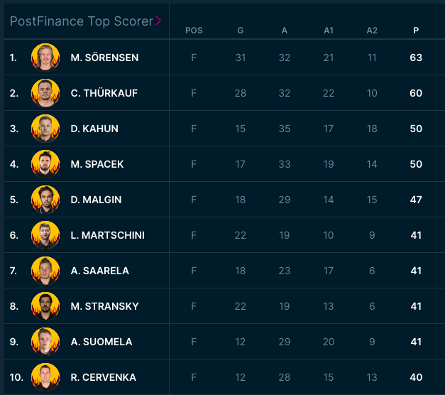 Top 10 des meilleurs pointeurs de la saison régulière de National League 05/03/2024 Follow SwissHabs Derniers articles Il y a 6 heures Plusieurs joueurs touchés du côté de Davos Il y a 8 heures Kevin Fiala aura un nouveau coach Il y a 9 heures Pavel Rosa restera lui aussi derrière le banc du CP Berne Il y a 11 heures Simas Ignatavicius, itinéraire d’un enfant drafté Il y a 14 heures Les Swiss Devils célèbrent la cuisine helvète au New Jersey