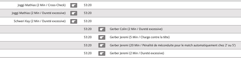 Un match pas vraiment amical entre Ajoie et Berne 19/02/2022 37 minutes de pénalité au total contre Berne Follow SwissHabs Derniers articles Il y a 5 heures Davos renversant, Fribourg surpris d'entrée Il y a 9 heures Formation des équipes et joueurs indisponibles pour le match Fribourg vs Rapperswil Il y a 9 heures Formation des équipes et joueurs indisponibles pour le match Davos vs Zoug Il y a 10 heures Petite précision sur le contrat d'Henrik Borgström Il y a 11 heures Plusieurs licences B du côté de Genève