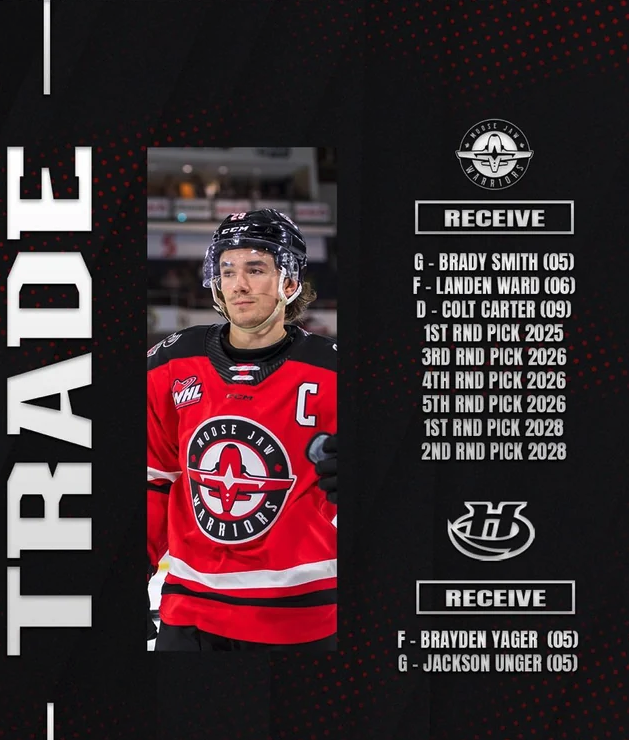 Afin d'acquérir les services de Yager - un espoir très recherché des Winnipeg Jets - et du vétéran gardien de but Unger, les Hurricanes ont envoyé un énorme paquet à Moose Jaw, comprenant l'attaquant de 18 ans Landen Ward, le gardien de 19 ans Brady Smith, l'espoir de 15 ans Colt Carter, deux choix de première ronde (2025, 2028), un choix de deuxième ronde (2028), un choix de troisième ronde (2025), un choix de quatrième ronde (2026) et un choix de cinquième ronde (2026).