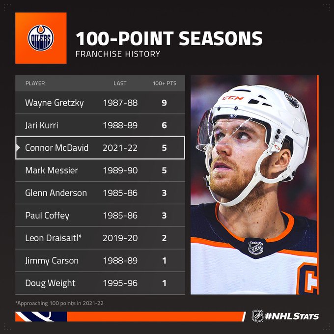 Connor McDavid est devenu le quatrième joueur de l'histoire des Oilers à enregistrer au moins cinq saisons de 100 points, après Wayne Gretzky (9), Jari Kurri (6) et Mark Messier (5).